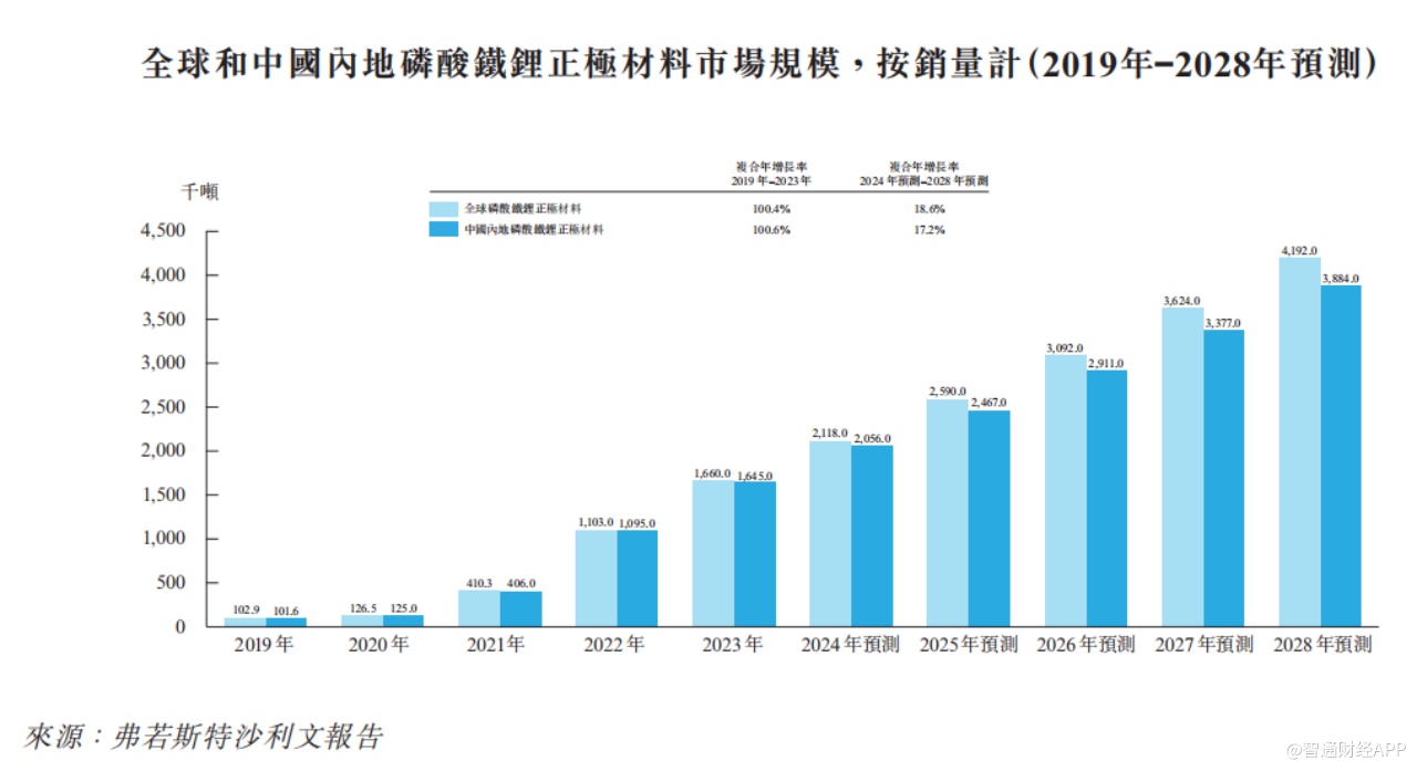 根据弗若斯特沙利文报告,2019年至2023年,全球磷酸铁锂正极材料市场销量以复合年增长率达到100.4%。该增长主要是由于来自新能源汽车和储能系统领域的需求增加、电池技术和热管理系统的进步以及磷酸铁锂电池固有的成本优势。预计全球磷酸铁锂正极材料行业2028年的销量将达到419.2万吨,从2024年起的复合年增长率为18.6%。