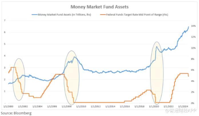 从历史经验来看,投资者在美联储大幅降息之前,通常不会大规模撤出货币市场基金。尽管美联储在九月份降息50个基点,但其短期利率仍保持在4.75%到5%的历史高位。根据美联储最新的预测,到明年年底,利率范围预计在3.25%至3.5%之间。