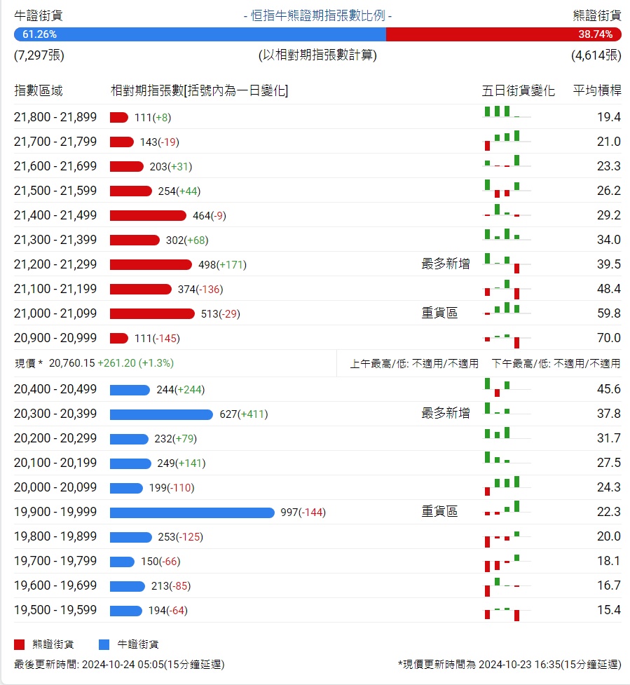 牛证街货重货区在19900-19999区间,该区间最新熊证数量为997张,较上一交易日减少144张;最多新增在20300-20399区间,该区间最新牛证数量为627张,较上一交易日增加411张。