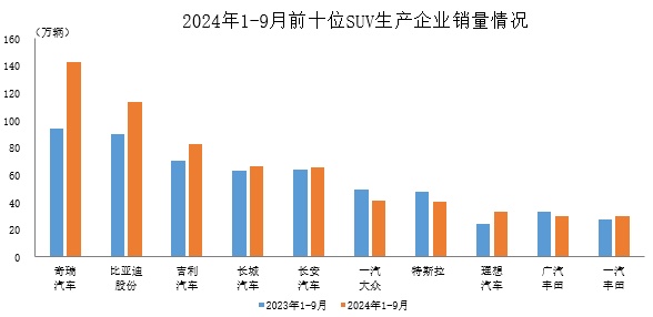智通财经APP获悉,据中国汽车工业协会统计分析,2024年1-9月,销量排名前十位的SUV生产企业共销售646.6万辆,占SUV销售总量的65.1%。