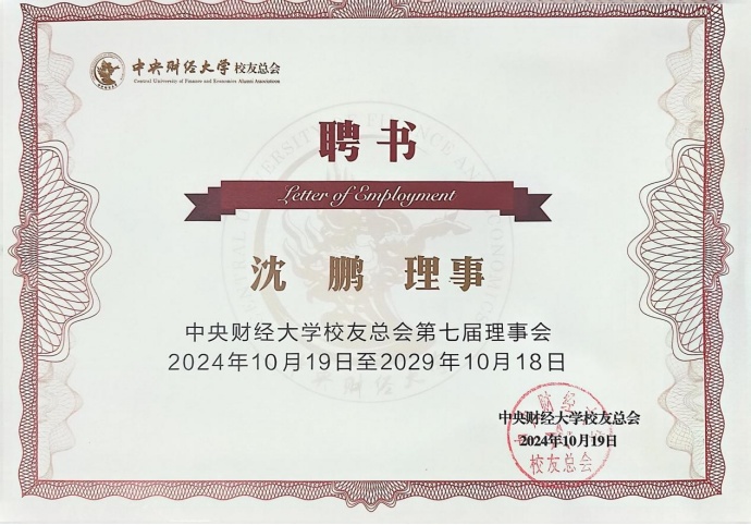 为搭建秩年年级校友常态化联系机制,中央财经大学决定成立今年恰逢毕业秩年的1984届、1994届、2004届、2014届校友年级理事会,在聘任仪式上,中央财经大学校长马海涛为各位理事颁发聘书。在中央财经大学校友总会理事会换届大会上,中央财经大学06级校友、水滴公司创始人兼CEO沈鹏获聘担任中央财经大学校友总会第七届理事会理事。沈鹏表示,未来将积极参与到校友工作当中,努力成为连接校友与校友、校友和母校之间的纽带。