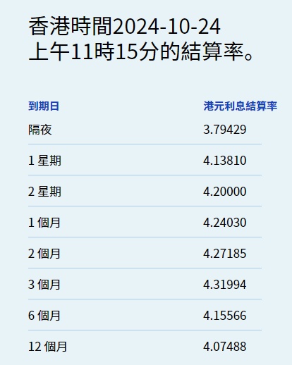 智通财经APP获悉,10月24日,港元折息普遍向上,与楼按相关的一个月拆息报4.2403%,升0.012基点,终止两连跌;反映银行资金成本的三个月拆息报4.31994%,升2.065基点。