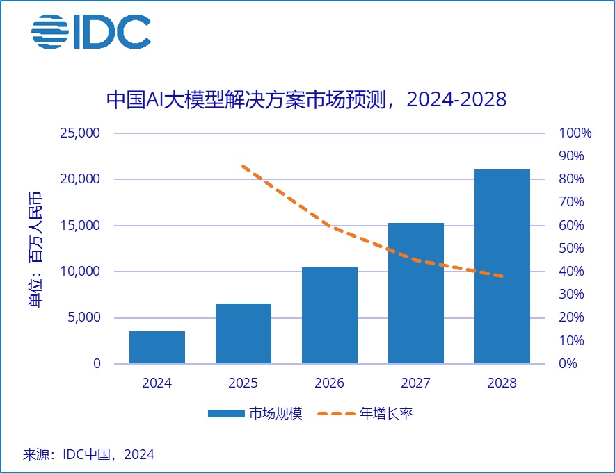 (IDC)最新发布的《中国模型即服务(MaaS)及AI大模型解决方案市场追踪,2024H1》报告显示,中国MaaS市场的规模在2024上半年已达到2.5亿元人民币,2024-2028年,这一市场预计将继续快速增长,年均复合增长率为64.8%,到2028年市场总规模将达到38亿元人民币。2024上半年中国AI大模型解决方案市场的规模为13.8亿元人民币,预计在2024-2028年期间也将持续高速增长,年均复合增长率为56.2%,到2028年整体市场规模将达到211亿元人民币。
