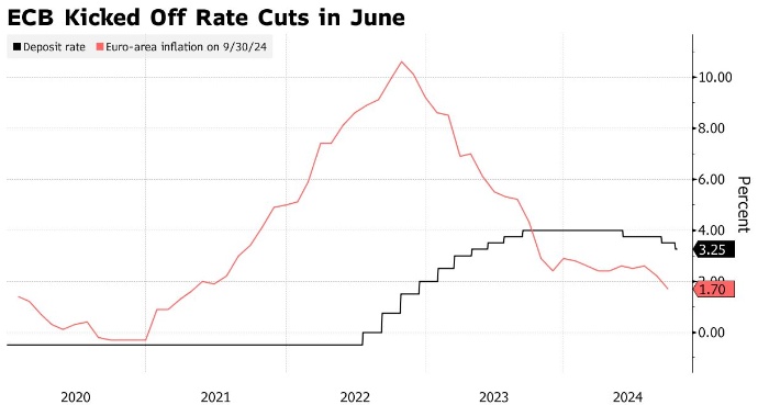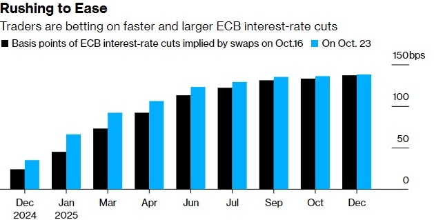上周,欧洲央行进行了今年第三次降息,将主要存款利率降至3.25%。经济学家和交易员预计,未来几个月还会有更多的降息。媒体周三报道称,欧洲央行开始讨论是否应将利率下调至中性水平以下,以刺激经济。此后,市场重新定价。欧元区整体通胀率已经低于2%的目标,而昔日的经济强国德国正陷入衰退。