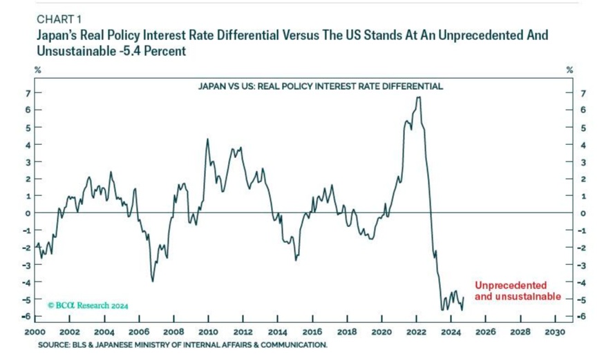 这是一个什么概念呢?自2022年以来,日本相对于美国的实际政策利率差已发生了-12个百分点的显著变化。全球两个主要经济体之间的实际政策利率差异,在如此短的时间内发生如此大的转变,是前所未有的。