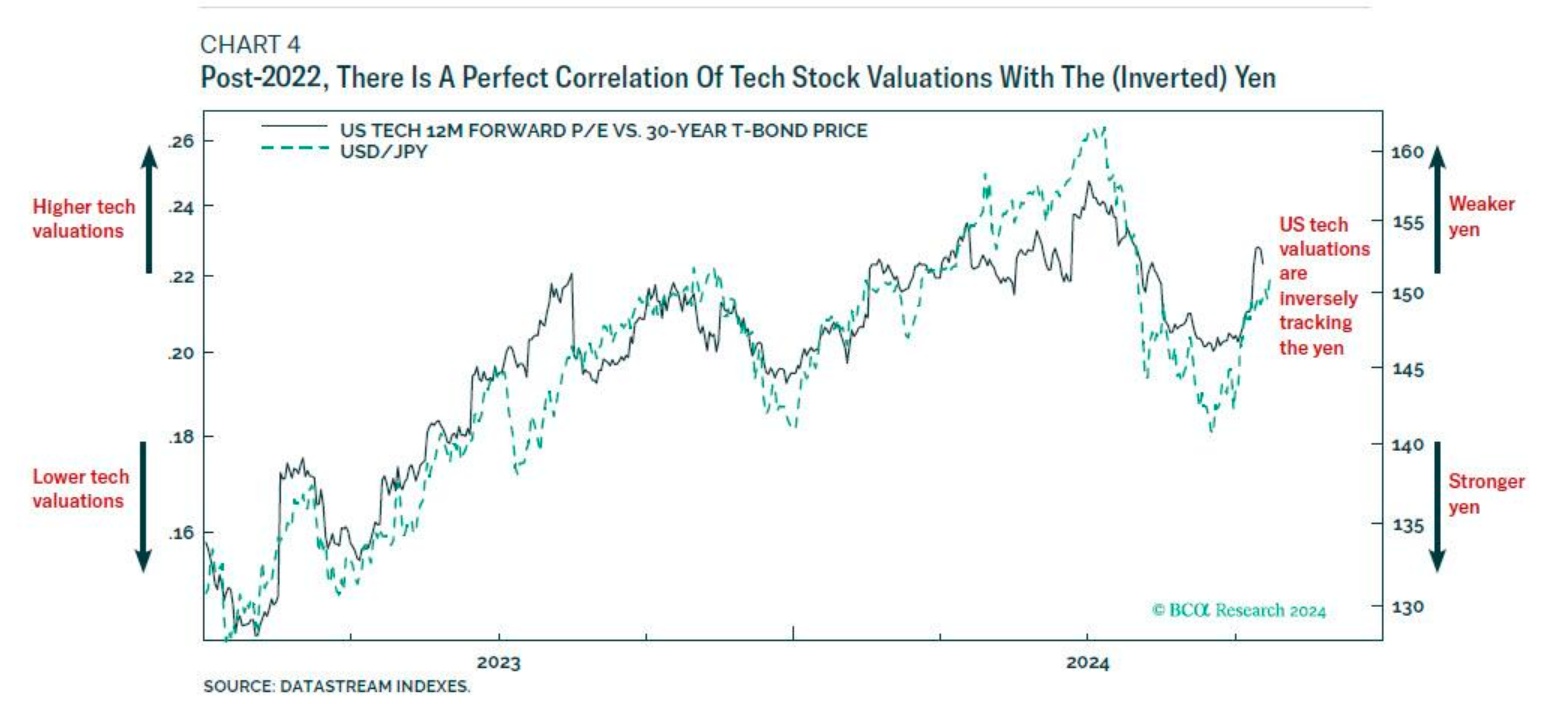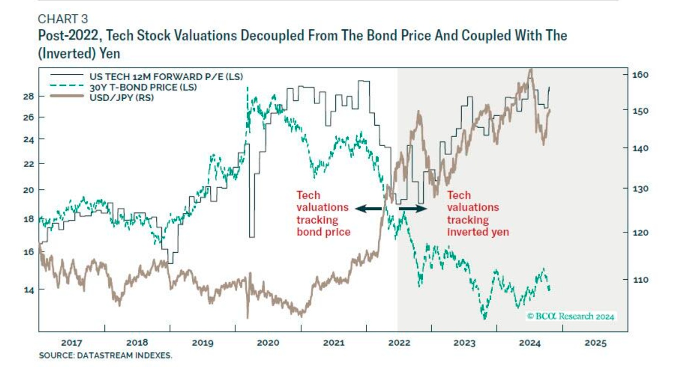 但从2022年下半年开始,这些关联性全都改变了——科技股估值与长期债券价格极速脱钩,与日元也开始几乎完全呈现负相关。