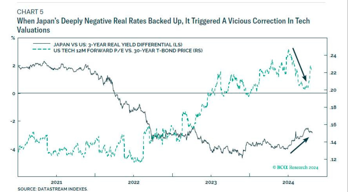 而最令人担忧的是,(至少在7月的日元套利交易解除风暴前)几乎没有人注意到,日本相对于美国的深度负实际利率,已经助长了美国科技股估值的大幅膨胀。