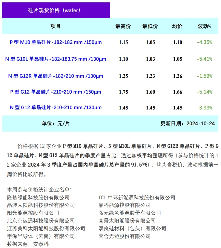 /130μm/256mm)成交均价降至1.05元/片,跌幅达5.41%;N型G12R单晶硅片(182*210mm/130μm)成交均价降至1.26元/片,跌幅达1.59%;N型G12单晶硅片(210*210