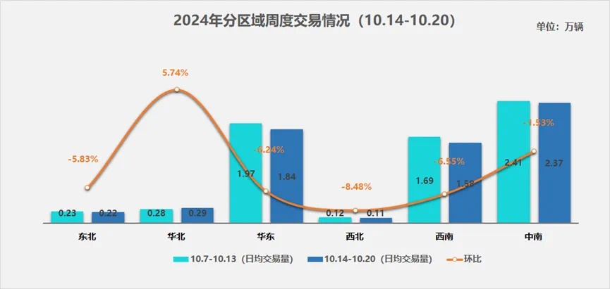本周大部分地区二手车市场热度有所减退,除华北地区小幅增长以外,其它地区交易量均有所下降。