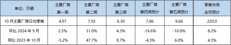 10月第一周均为国庆节假日,日均零售4.97万辆,同比-5.2%,环比2.5%。第二周各厂商集中交付国庆节期间收取的订单,交车进度较同期提升明显,日均零售达7.92万辆,同比47.7%,环比31.0%。假期订单陆续交付完成后,第三周零售市场相较第二周有所回落,日均零售6.30万辆,同比8.7%,环比4.3%。10月第四周车市继续维持回暖态势,预计日均销量7.86万;第五周市场预计稳中向好,日均零售9.66万辆,同比6.0%,环比-10.8%,综合估算10月零售可达到220万辆左右。