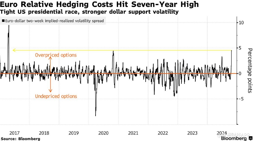 由于欧洲和美国的利率轨迹不同,投资者正在购买保护性产品。市场预期欧洲央行将大幅降息以刺激经济,而唐纳德·特朗普当选美国总统可能会重新引发通胀——这意味着美联储利率高企和美元进一步升值。