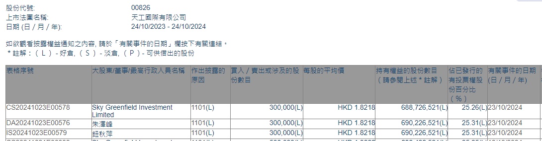 智通财经APP获悉,香港联交所最新资料显示,10月23日,天工国际(00826)CEO朱泽峰通过其名下公司Sky Greenfield Investment Limited增持公司30万股,每股作价1.8218港元,总金额为54.65万港元。增持后朱泽峰最新持股数目约为6.90亿股,最新持股比例为25.31%。