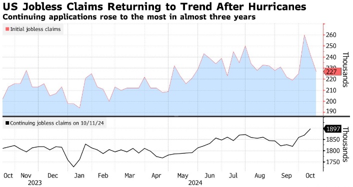 虽然从传统上看,申请失业金人数的上升表明人们找工作的难度加大,但最近的数据可能反映了这两场风暴的影响。经济学家说,波音公司(BA.US)持续数周的罢工可能也模糊了数据的信号。周三,约3.3万名工厂工人拒绝签订新的劳动合同,此后罢工仍在继续。