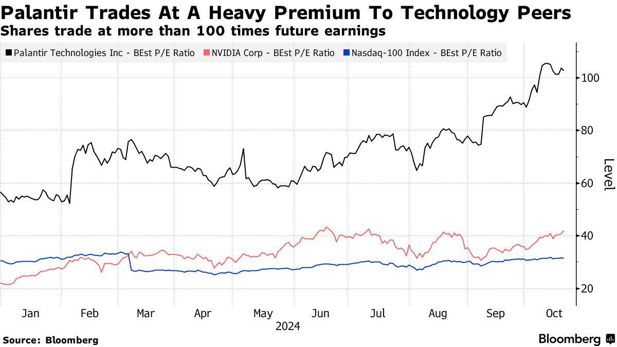 不过,华尔街分析师并不认为Palantir股价的强劲势头将持续下去。分析师们对该股的平均目标价意味着该股未来12个月有超过30%的下跌空间。分析师们的谨慎主要源自Palantir的高估值,该股的预期市盈率超过100倍,较其他人工智能公司有很大溢价。相比之下,“AI霸主”英伟达(NVDA.US)的预期市盈率约为37倍,同样受益于人工智能相关利好的软件公司甲骨文(ORCL.US)的预期市盈率仅为26倍。