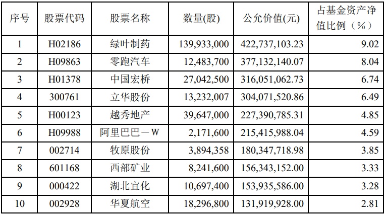 中庚价值领航三季度末前十大重仓股为:绿叶制药(02186)、零跑汽车(09863)、中国宏桥(01378)、立华股份(300761.SZ)、越秀地产(00123)、阿里巴巴-W(09988)、牧原股份(002714.SZ)、西部矿业(601168.SH)、湖北宜化(000422.SZ)、华夏航空(002928.SZ)。