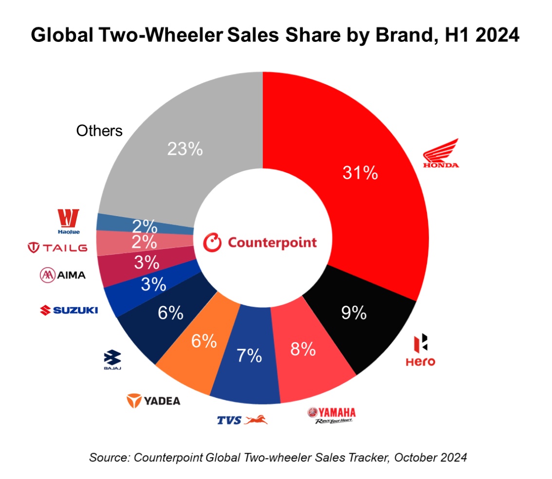 2024 年上半年,全球前十大两轮车制造商占据了 75% 以上的销售额。本田在全球两轮车市场保持领先地位,其次是Hero MotoCorp、雅马哈、TVS Motor和雅迪。TVS Motor是前十大品牌中增长最快的品牌(同比增长25%),而雅迪的下滑幅度最大(同比下降29%),滑落至第五位。