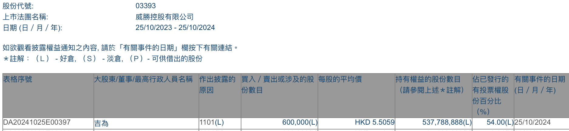 智通财经APP获悉,香港联交所最新资料显示,10月25日,公司执行董事兼主席吉为增持威胜控股(03393)60万股,每股作价为5.5059港元,总金额约为330.35万港元。增持后最新持股数目约为5.38亿股,持股比例为54%。