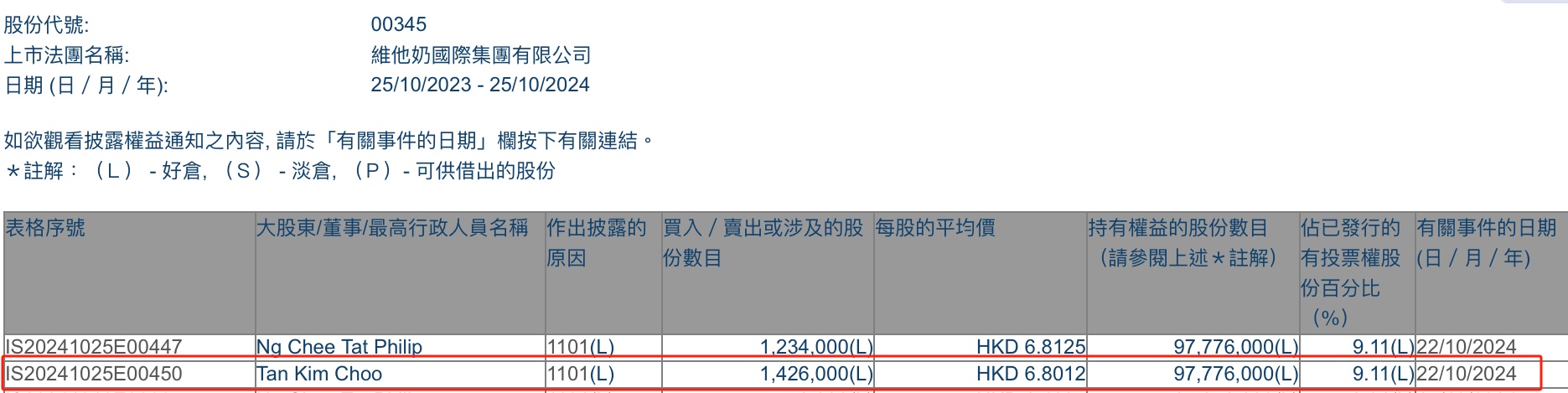 Choo增持维他奶国际(00345)142.6万股,每股作价6.8012港元,总金额约为969.85万港元。增持后最新持股数目为9777.6万股,最新持股比例为9.11%。