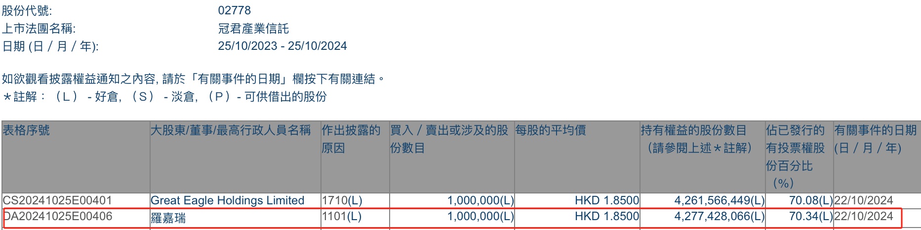 智通财经APP获悉,香港联交所最新资料显示,10月22日,集团主席罗嘉瑞增持冠君产业信托(02778)100万股,每股作价1.85港元,总金额为185万港元。增持后最新持股数目约为42.77亿股,最新持股比例为70.34%。