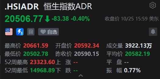 智通财经APP获悉,周五美股三大指数涨跌不一,恒生指数ADR下跌,按比例计算,收报20506.77点,较香港收市下跌83.38点或0.40%。