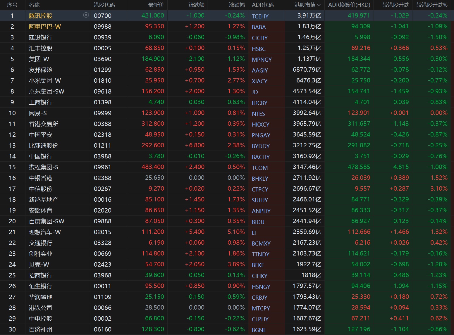 大型蓝筹股多数下跌,汇丰控股收报68.85港元,较香港收市涨0.15%;腾讯控股收报421.00港元,较香港收市跌0.24%。