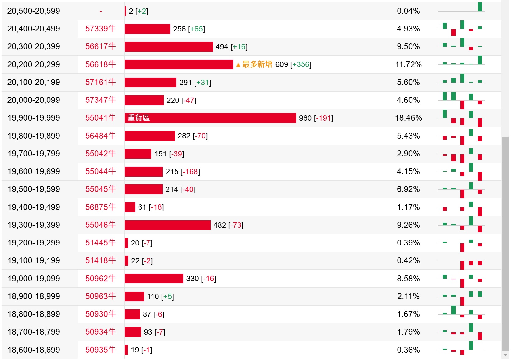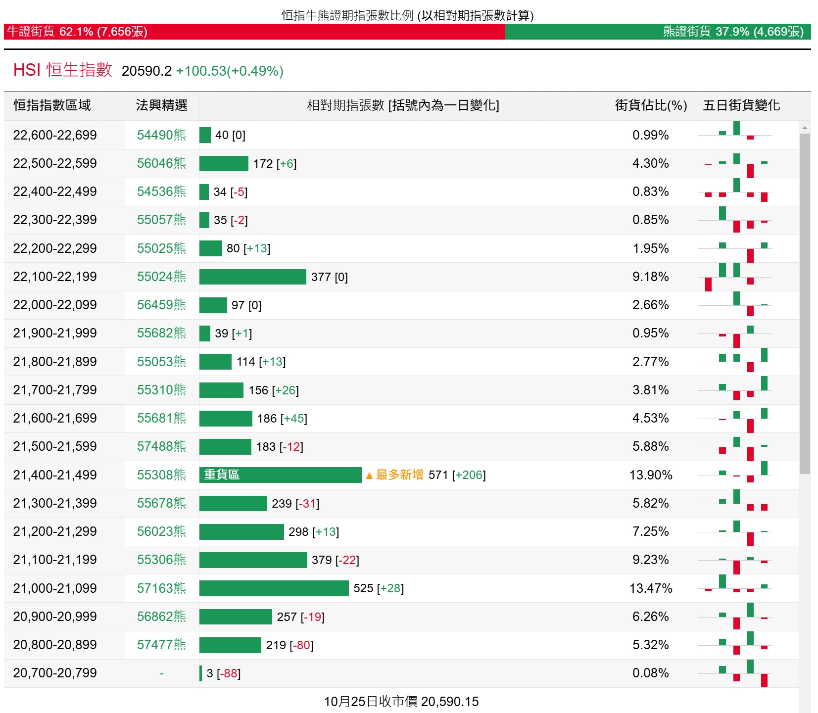 牛证街货重货区在19900-19999区间,该区间最新熊证数量为960张,较上一交易日减少191张;最多新增在20200-20299区间,该区间最新牛证数量为609张,较上一交易日增加356张。
