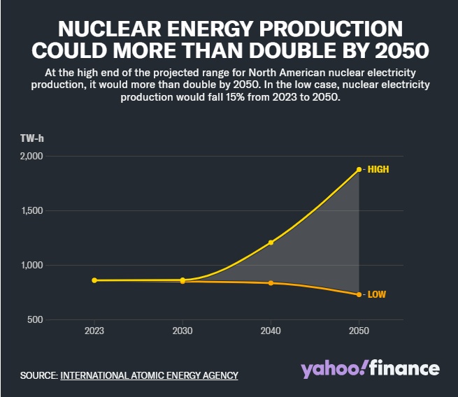 高盛估计,在人工智能需求的推动下,到2030年全球数据中心的电力消耗将增长160%。与此同时,来自国际原子能机构的独立数据显示,到2050年,北美的核电产量可能会翻一番。