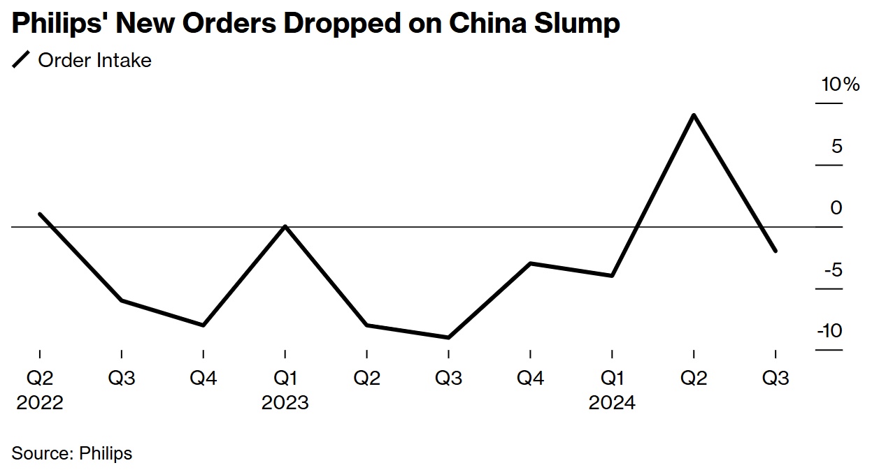 智通财经APP获悉,荷兰皇家飞利浦(PHG.US)因中国市场需求低迷而大幅下调了今年的销售增长预期,预计2024年可比销售额增长仅为0.5%至1.5%,远低于之前的3%至5%预期。第三季度订单量下降2%,可比销售额持平于44亿欧元,低于分析师预测。尽管调整后的EBITA利润率达到11.8%,符合预期上限,但中国市场的不确定性预计将持续至未来几个季度。此外,飞利浦仍在应对与睡眠呼吸暂停设备故障相关的美国索赔,以及美国司法部的调查,但这些法律诉讼的潜在影响未包含在前景展望中。