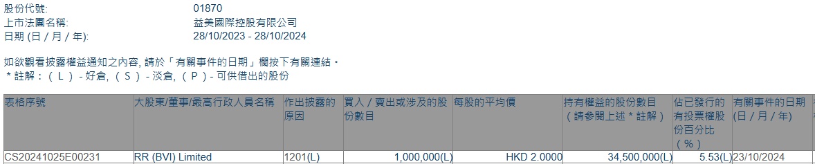 智通财经APP获悉,香港联交所最新资料显示,10月23日,RR(BVI)Limited减持益美国际控股(01870)100万股,每股作价2港元,总金额为200万港元。减持后最新持股数目约为3450万股,最新持股比例为5.53%。