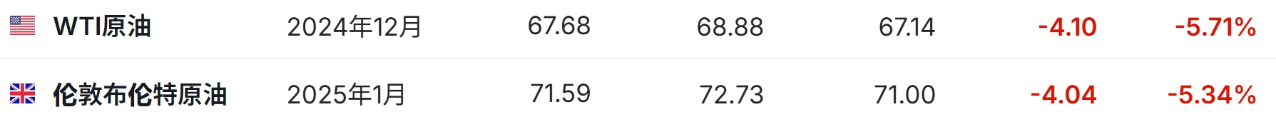 3. 截至发稿,WTI原油跌5.71%,报67.68美元/桶。布伦特原油跌5.34%,报71.59美元/桶。