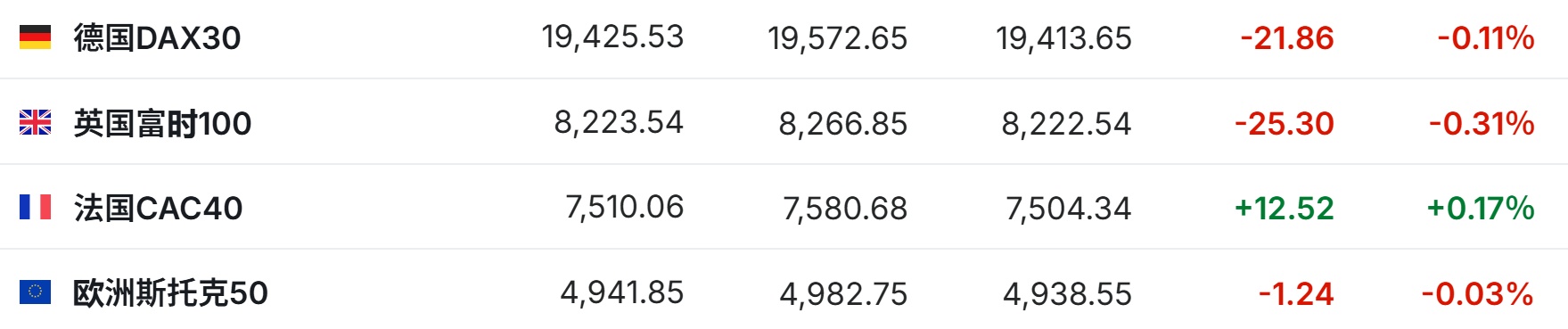 2. 截至发稿,德国DAX指数跌0.11%,英国富时100指数跌0.31%,法国CAC40指数涨0.17%,欧洲斯托克50指数跌0.03%。