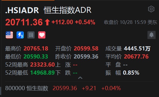 智通财经APP获悉,周一美股三大指数全线上涨,恒生指数ADR上涨,按比例计算,收报20711.36点,较香港收市上涨112.00点或0.54%。