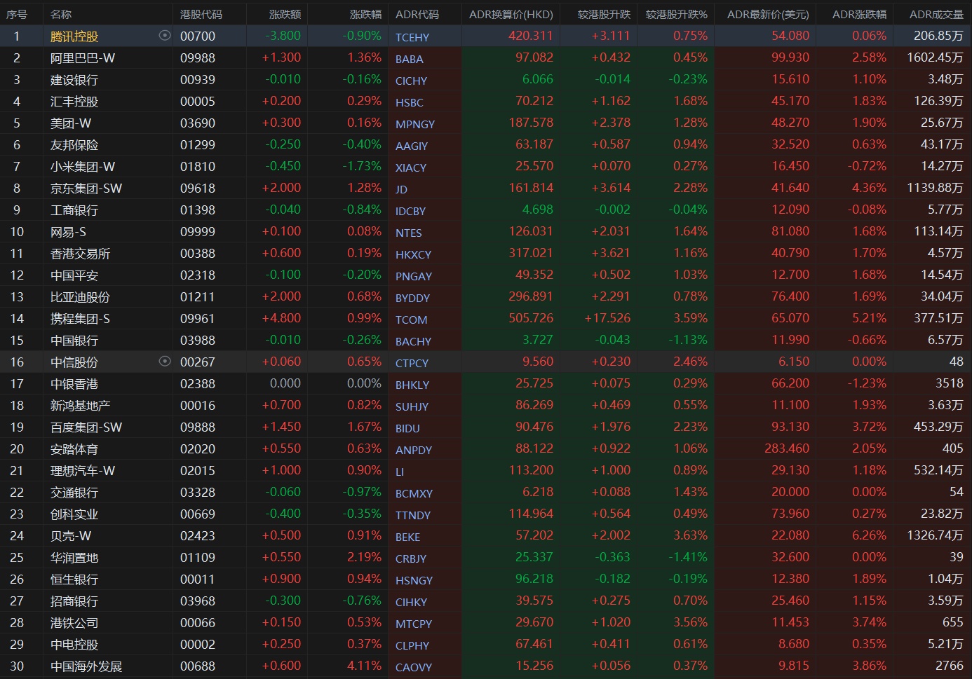 大型蓝筹股多数上涨,汇丰控股收报70.212港元,较香港收市涨1.68%;腾讯控股收报420.311港元,较香港收市涨0.75%。