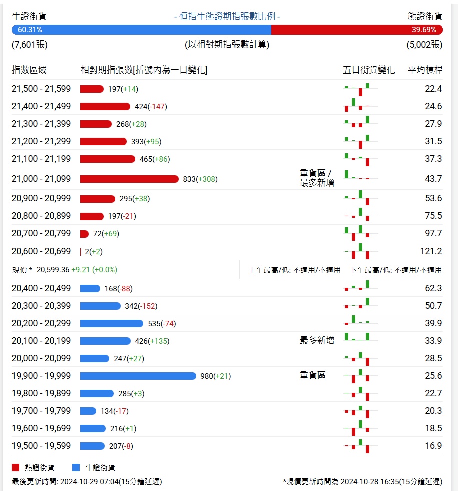 中信证券牛熊证街货分布图中的数据显示,熊证街货重货区在21000-21099区间,该区间最新熊证数量为833张,较上一交易日增加308张;最多新增同样在21000-21099。