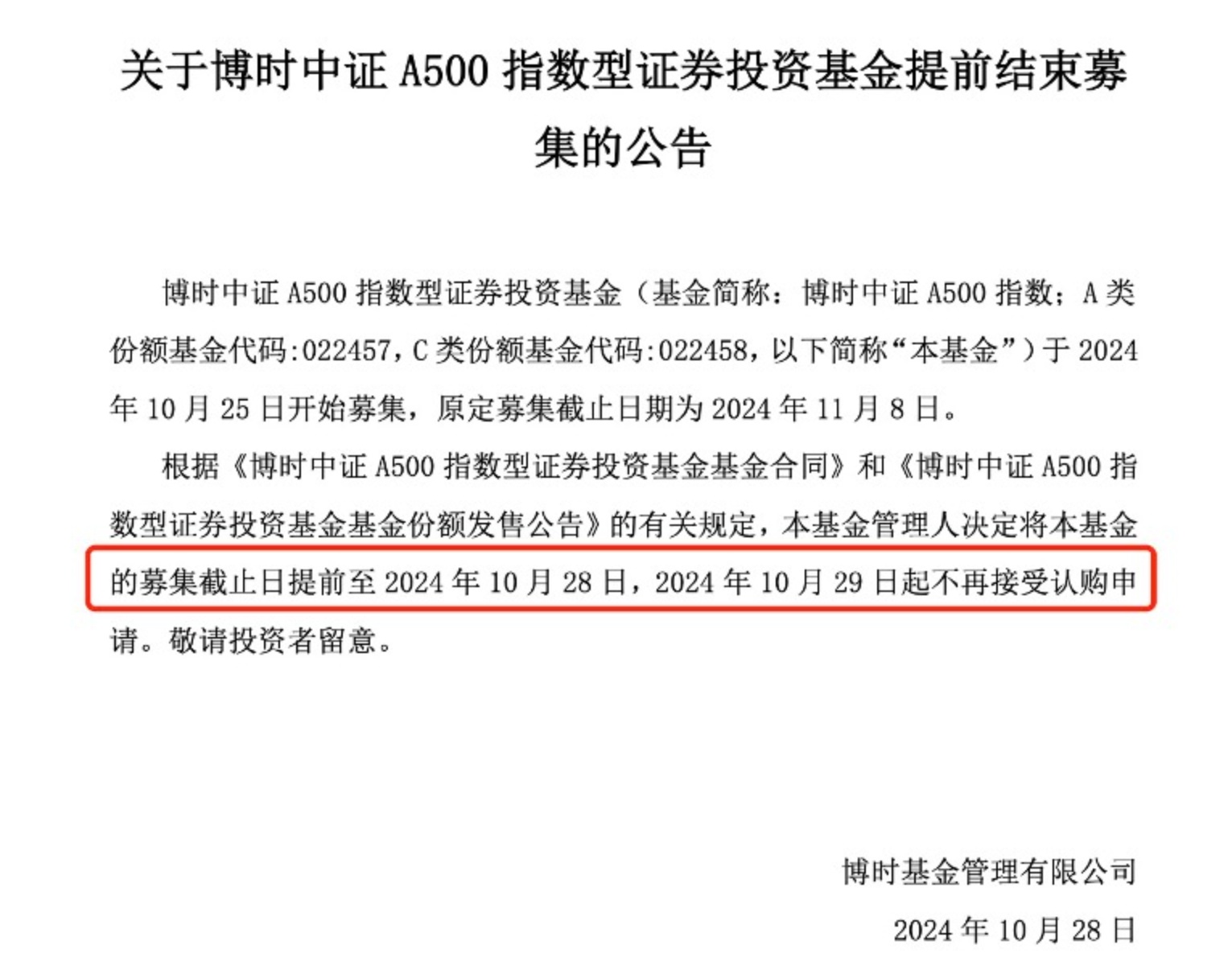 三是再现提前结募,依然是博时。博时基金公告称,决定将募集截止日提前至今日,10月29日起不再接受认购申请。仅发行2日,博时中证A500指数基金完成首募。渠道消息显示,博时中证A500指数基金募集规模超过30亿,该基金的主要销售渠道同样在招行。在募集首日就提前结束的泰康中证A500ETF联接基金,募集规模超50亿。