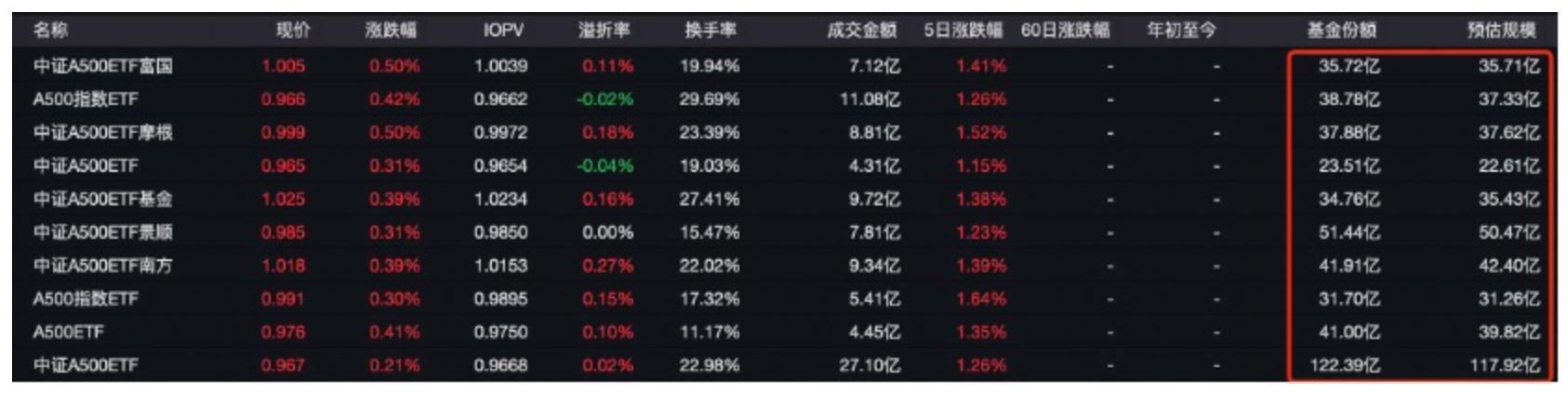 值得注意的是,截至目前,首批上市10只中证A500ETF合计规模超过450亿元,加上300亿未上市的场外基金,中证A500指数自9月23日推出,不到一个月时间,围绕着指数的相关基金规模已经超过750亿。业内指出,中证A500指数或将成为最快完成千亿规模级宽基指数。