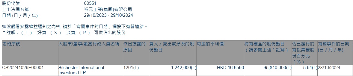 智通财经APP获悉,香港联交所最新资料显示,10月28日,Silchester International减持裕元集团(00551)124.2万股,每股作价16.655港元,总金额约为2068.55万港元。减持后最新持股数目为9584万股,最新持股比例为5.94%。