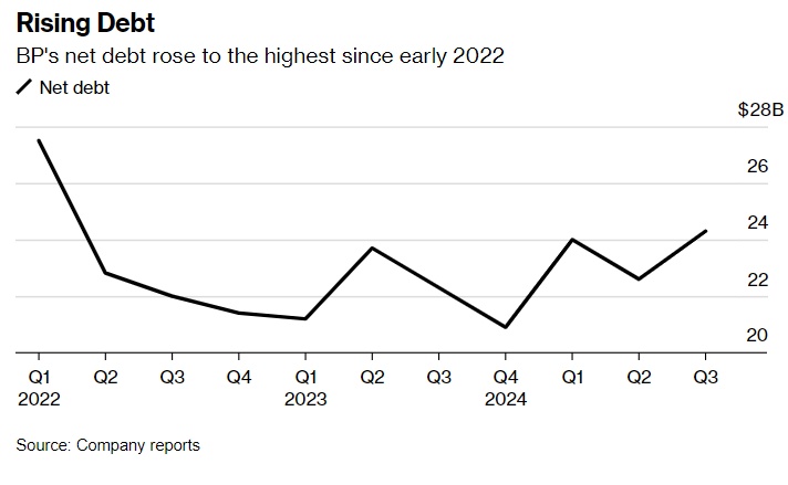 该公司继续借款以维持投资者回报,导致净债务大幅增加。虽然该公司持续依靠借款来暂时维持股票回购规模,但英国石油表示,明年2月,当公司更新其战略以及财务指引目标时,股票回购规模可能会发生变化。