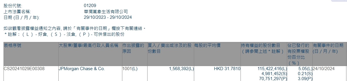 智通财经APP获悉,香港联交所最新资料显示,10月24日,小摩增持华润万象生活(01209)156.8392万股,每股作价31.781港元,总金额约为4984.51万港元。增持后最新持股数目约为1.15亿股,最新持股比例为5.05%。