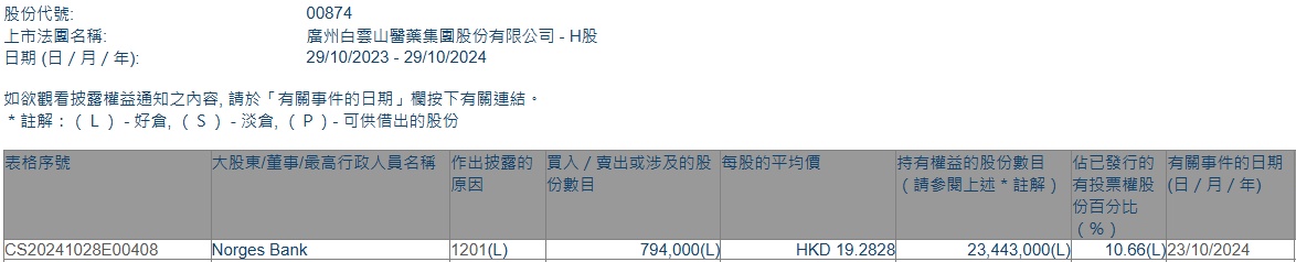 智通财经APP获悉,香港联交所最新资料显示,10月23日,Norges Bank减持白云山(00874)79.4万股,每股作价19.2828港元,总金额约为1531.05万港元。减持后最新持股数目为2344.3万股,最新持股比例为10.66%。
