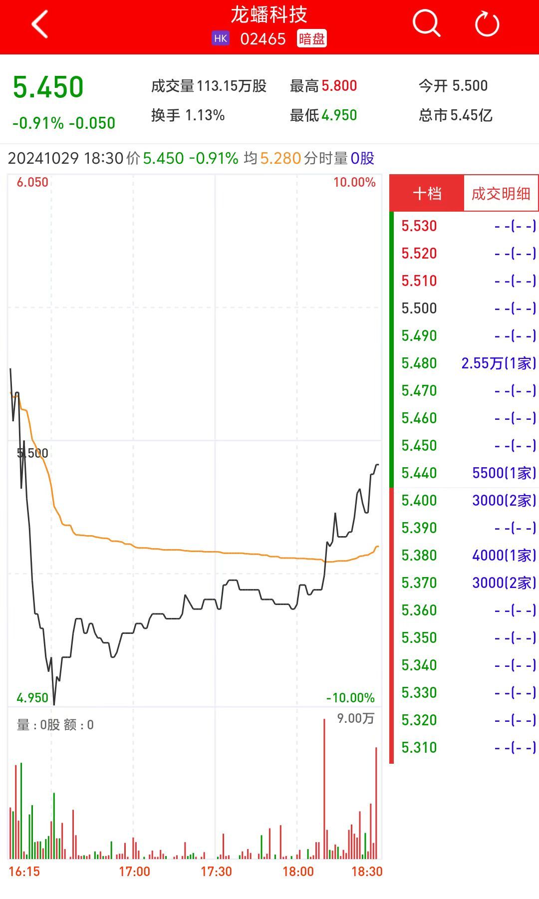 智通财经APP获悉,龙蟠科技(02465)将于10月30日(周三)在香港挂牌。截至收盘,利弗莫尔证券暗盘交易显示报价5.45港元,较招股价5.5港元下跌0.91%,每手500股,不计手续费,每手亏25港元。