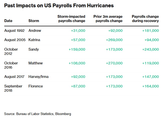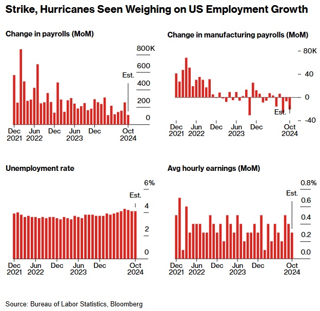 根据彭博对经济学家的调查,失业率预计将维持在 4.1%。无论最终结果如何,美国劳工统计局经常会评论风暴对数据的影响,而两周后发布的州级数据将显示北卡罗来纳州、佛罗里达州和其他受风暴影响的地区所受的影响——有助于提供进一步的清晰度。
