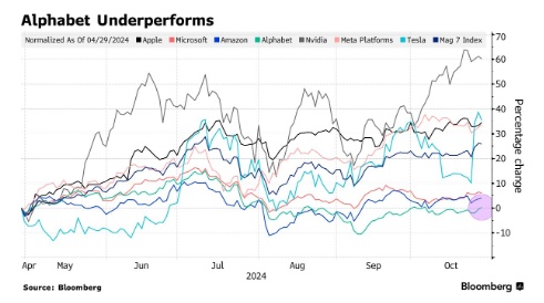 过去六个月,谷歌的股价基本持平,是大盘股中表现最差的。相比之下,彭博壮丽指数(Bloomberg Magnificent Index)在此期间上涨了近26%。