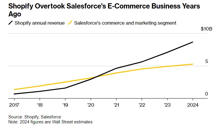 如今,Salesforce的电子商业和营销业务是其业务增长最缓慢的部分,多年来专注于电商领域的Shopify这一类别营收早在2021年就超过Salesforce这一类业务的整体营收。“他们肯定是这个领域中引人注目的竞争对手,”鲍尔表示。Salesforce表示,该公司也一直在吸引Shopify的客户,其中包括Black Rifle Coffee、ReserveBar以及孩之宝公司。