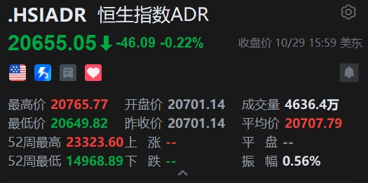 智通财经APP获悉,周二美股三大指数涨跌不一,恒生指数ADR下跌,按比例计算,收报20655.05点,较香港收市下跌46.09点或0.22%。