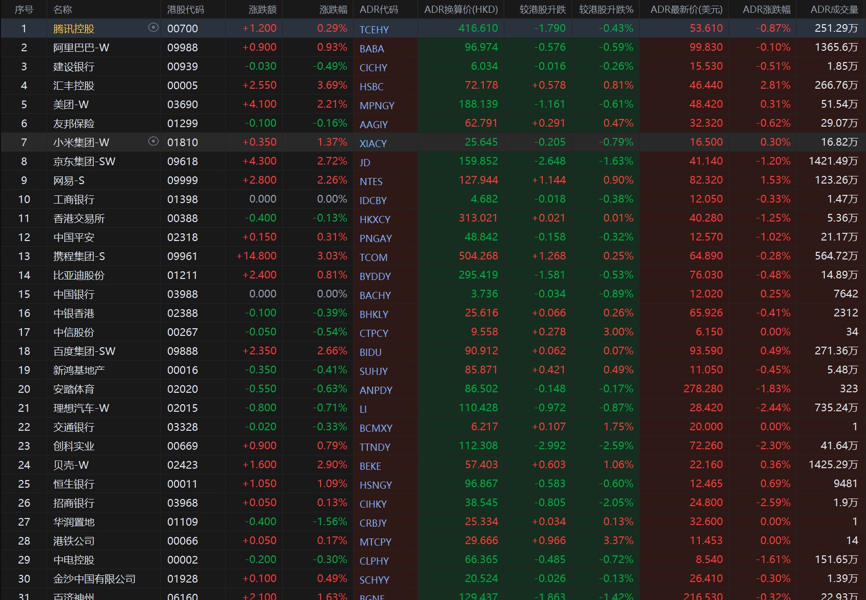大型蓝筹股多数上涨,汇丰控股收报72.178港元,较香港收市涨0.81%;腾讯控股收报416.610港元,较香港收市跌0.43%。