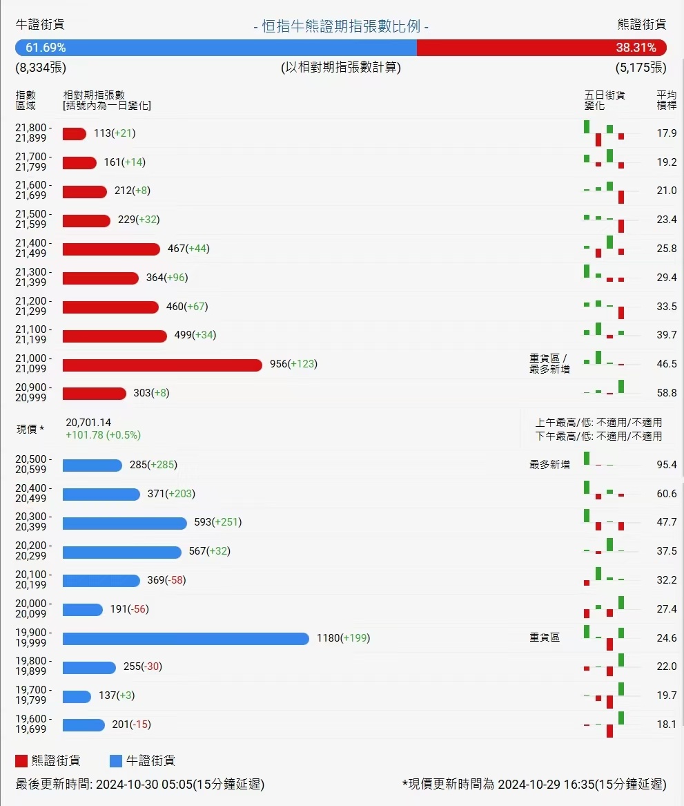 中信证券牛熊证街货分布图中的数据显示,熊证街货重货区在21000-21099区间,该区间最新熊证数量为956张,较上一交易日增加123张;最多新增同样在21000-21099。