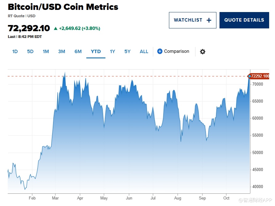 智通财经APP获悉,随着美国大选临近,比特币周二攀升至73,000美元上方,接近历史高点。