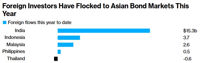 指数提供商富时罗素(FTSE Russell)最近的变动也提振了韩国和印度,该公司将这两个国家的主权债券纳入了两个单独的指数。巴克莱称,印度从明年开始被纳入新兴市场债务指数,可能会增加90亿美元的流入。