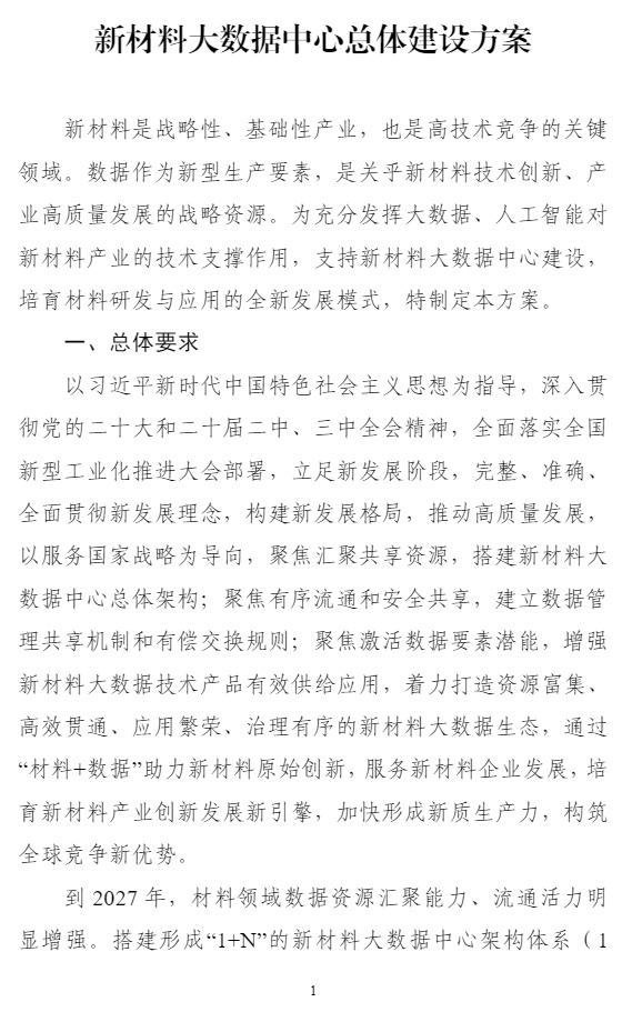 工业和信息化部 财政部 国家数据局关于印发《新材料大数据中心总体建设方案》的通知